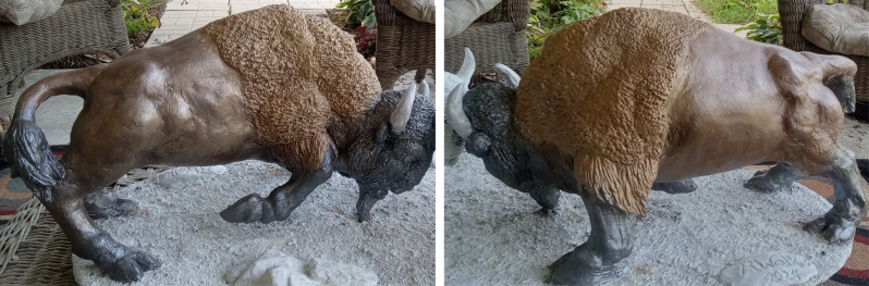 I have begun to apply "Bronzing" to the sculpture. The image above is the front and back of one of the two bison. I am using a series of colors by DecoArt, called Metallic Lustre'. The product is basically a wax, similar to shoe polish, that has been impregnated with metallic powder. I have used their "Black Shimmer" for the legs, tail, and head, "Iced Espresso" for the body, a combination of "Gold Rust" and "Iced Espresso" for the hump, and "White Frost" for the horns. I apply the colors with a stiff bristle brush, then polish it with a soft cloth. This is just the start of a long process, but it helped me establish the color pallet.