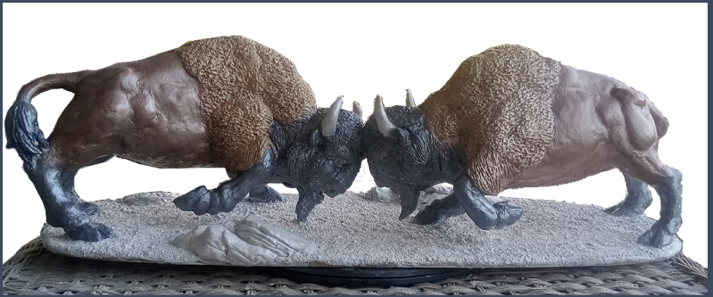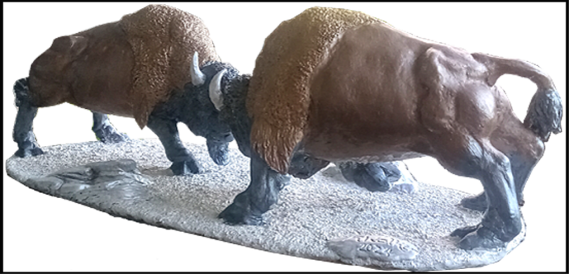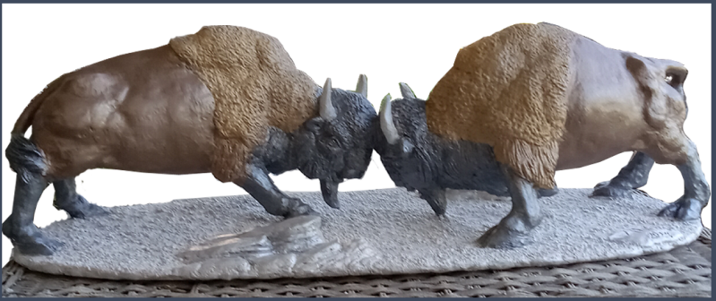 Bison breed in the summer. Male bison compete for mating rights, butting heads with other bulls. In these competitions, male bison may also lower their heads, paw at the ground, and emit a bellow which can be heard up to three miles away. This sculpture is called "Buttin' Heads", and was completed in late September of 2024.