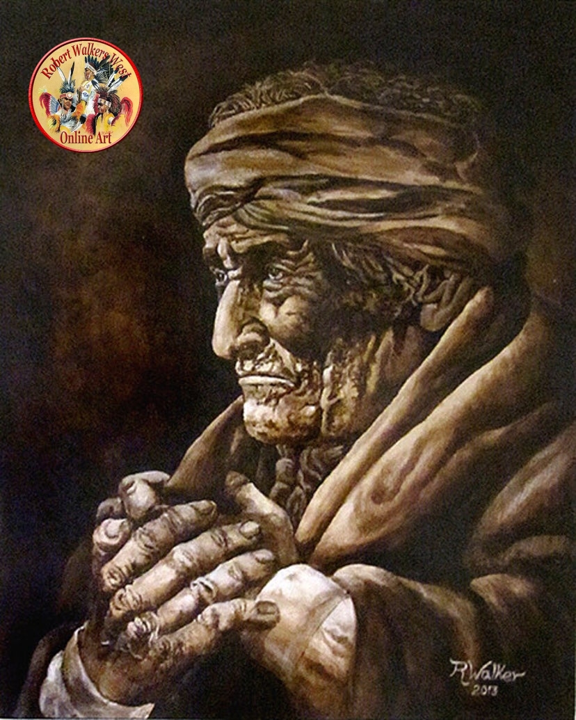 This 16 X 20 mono-color painting is of Geronimo in his last years, maybe thinking of his days in Arizona, fighting for his tribal lands.