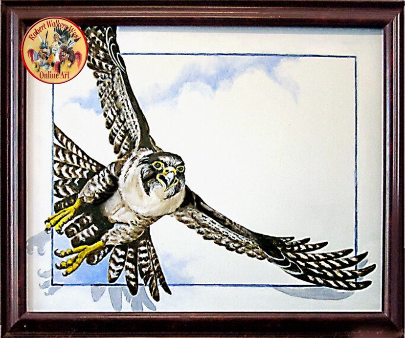 I created this original acrylic painting several years ago, just to see if I could. It is a Peregrine Falcon that uses the Trompe’ style that creates the illusion that it is flying out of its’ frame. I’m not sure how successful I was, but here it is.